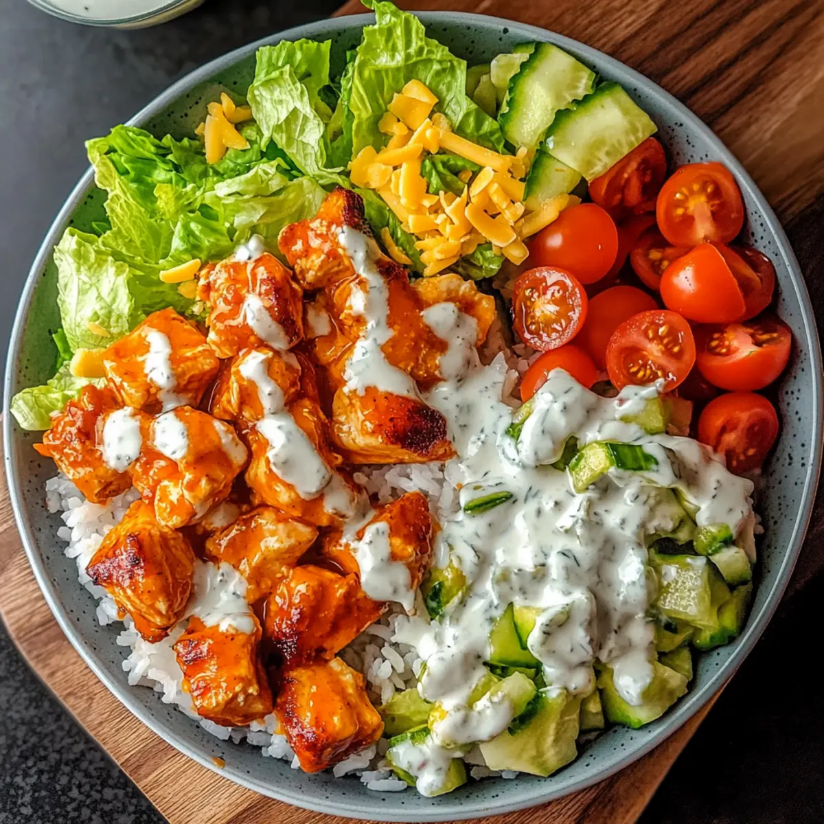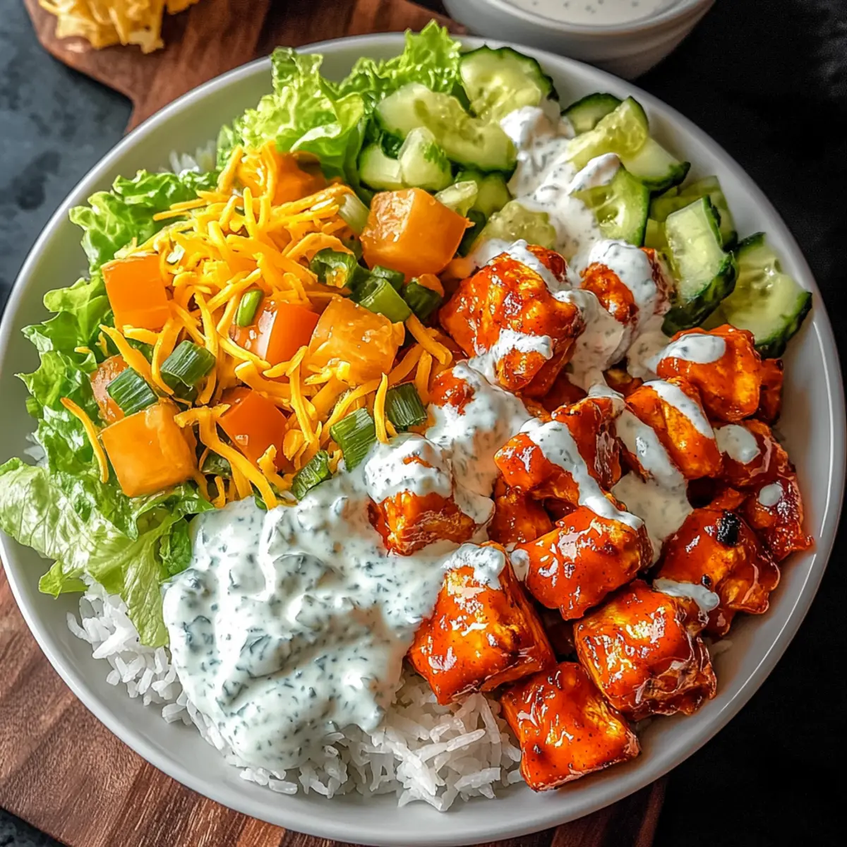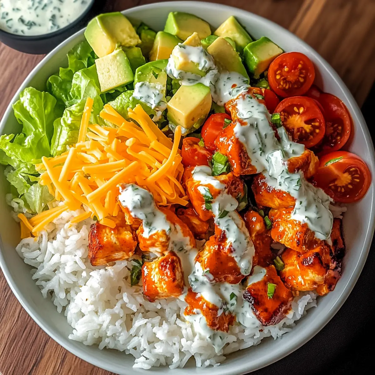 Sprinkle shredded cheddar cheese over the assembled bowls, allowing it to melt slightly from the warmth of the chicken. Drizzle with your favorite ranch or blue cheese dressing, which will provide a creamy balance to the spicy Buffalo sauce.