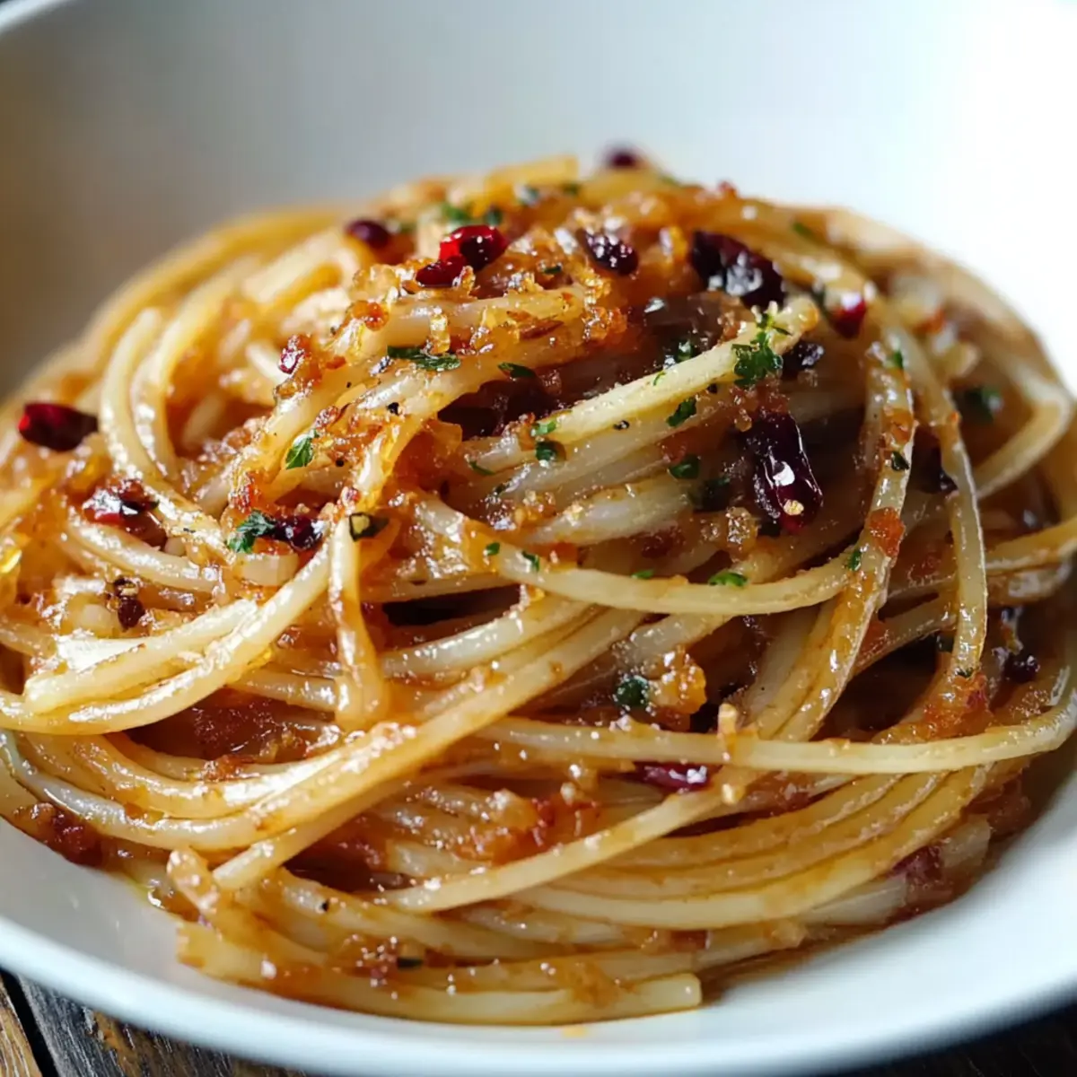Once the onions are caramelized and your pasta is cooked, add the cooked garlic from the chili oil to the skillet with the onions and sauté for another 1-2 minutes. Drain the pasta and add it to the skillet, stirring well to combine. Gradually pour in some reserved pasta water until the mixture reaches a silky, cohesive texture, marrying the flavors beautifully.