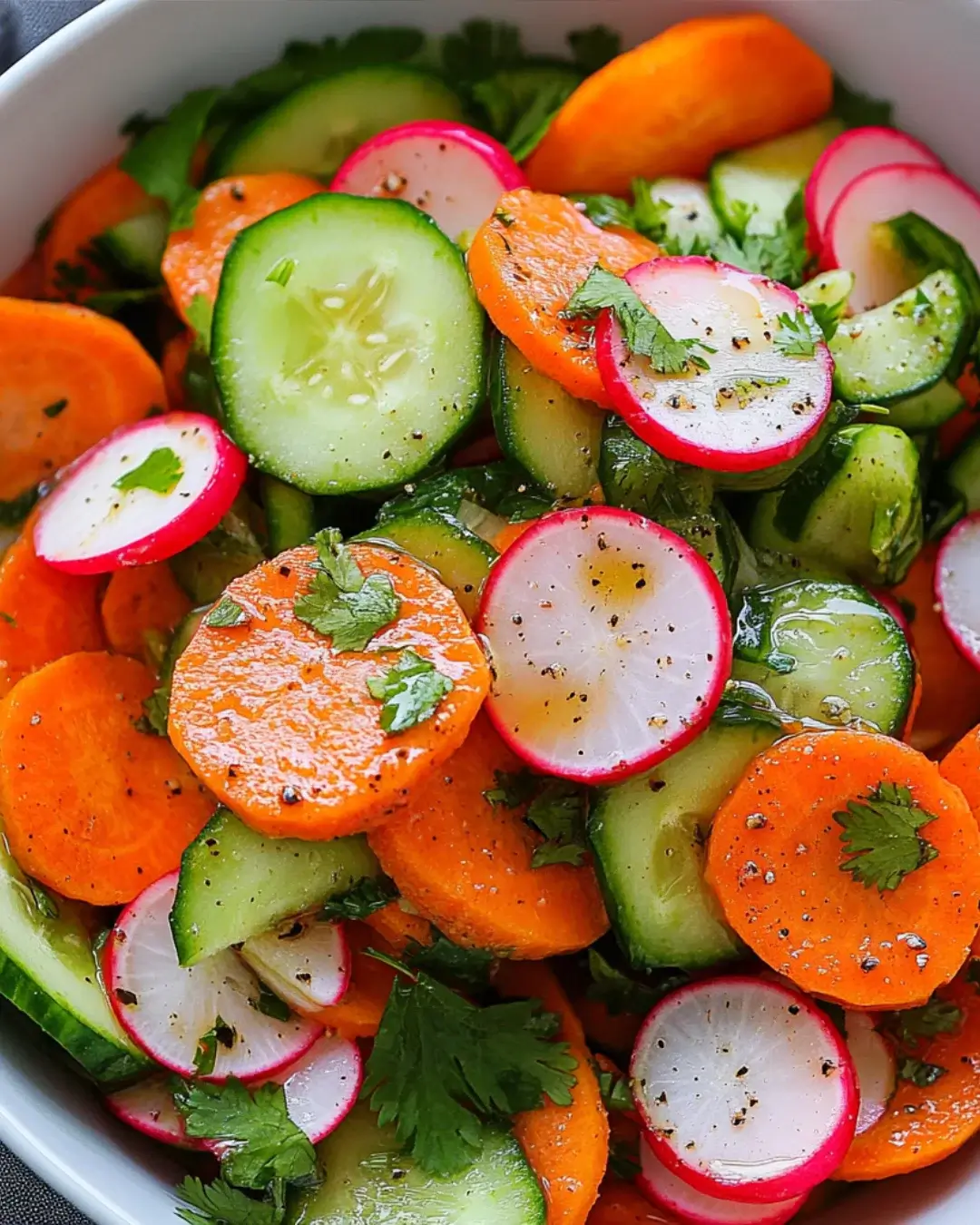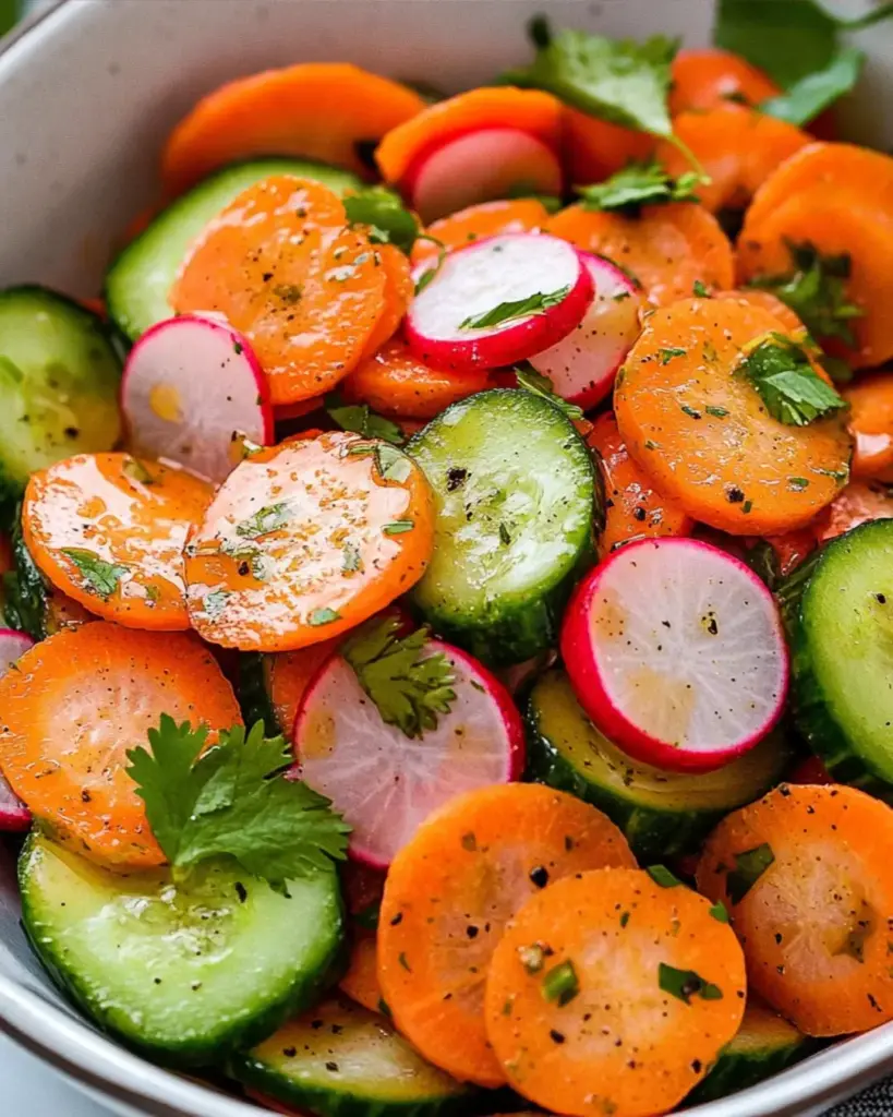 In a large mixing bowl, combine the grated carrots, chopped cucumber, radish, and parsley. Pour the dressing over the top and toss everything together. It’s important to coat all the ingredients evenly. This ensures that every bite is bursting with flavor. Don’t be shy—get in there and mix it up!