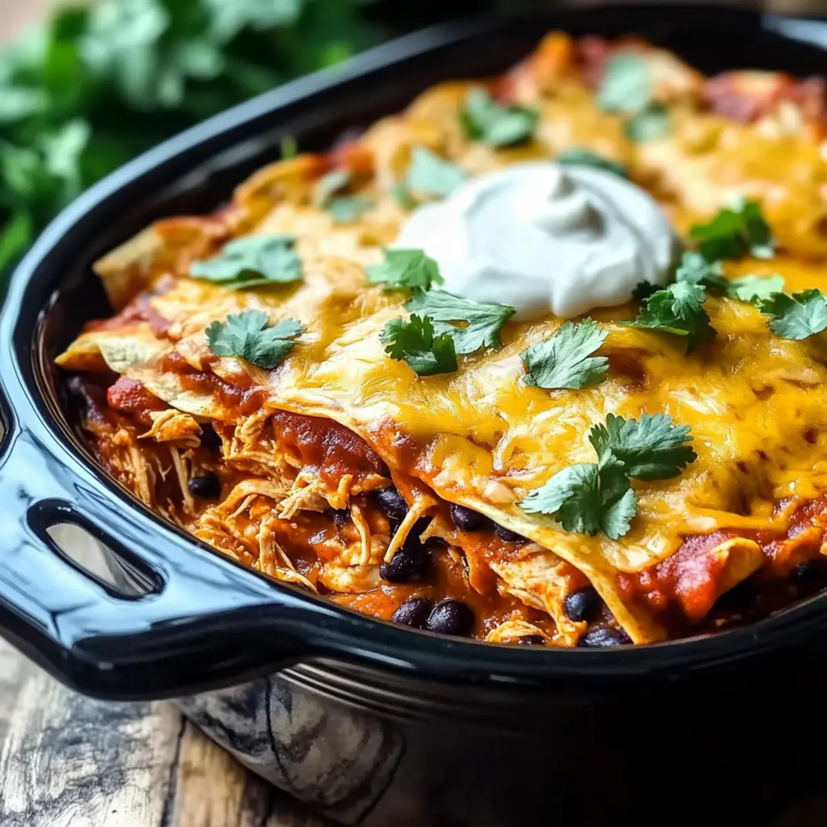 When ready, remove the casserole from the slow cooker carefully, allowing it to cool for a few minutes. Serve warm, garnishing with fresh cilantro or a dollop of sour cream. Pair your Chicken Enchilada Casserole with a fresh side salad or avocado slices for a wholesome meal. Enjoy the delightful flavors you’ve created!