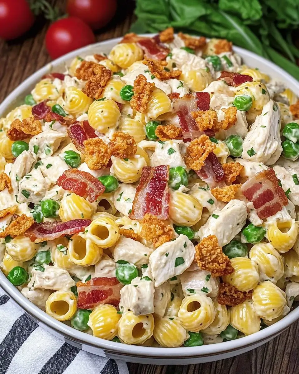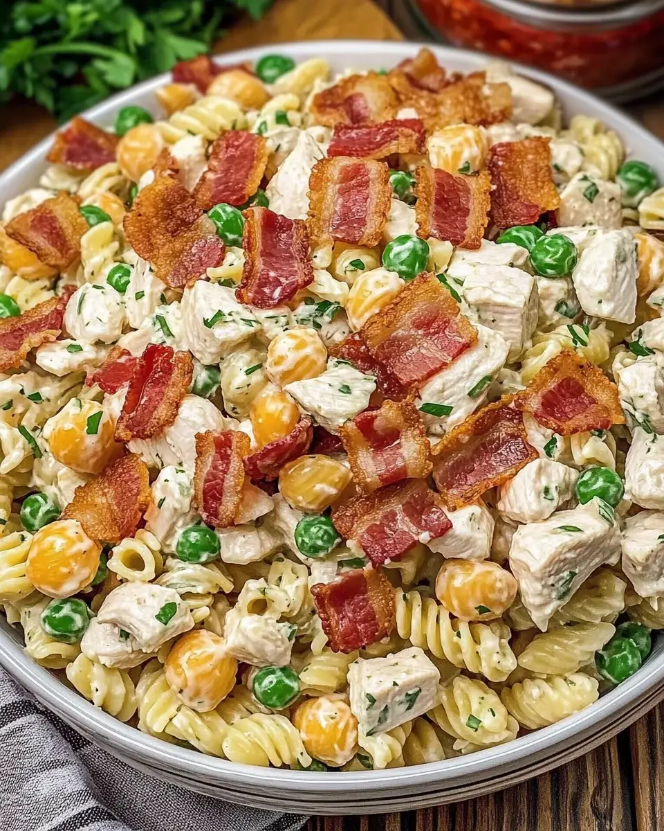 A delicious and refreshing pasta salad featuring crispy bacon, tender chicken, and a creamy ranch dressing.