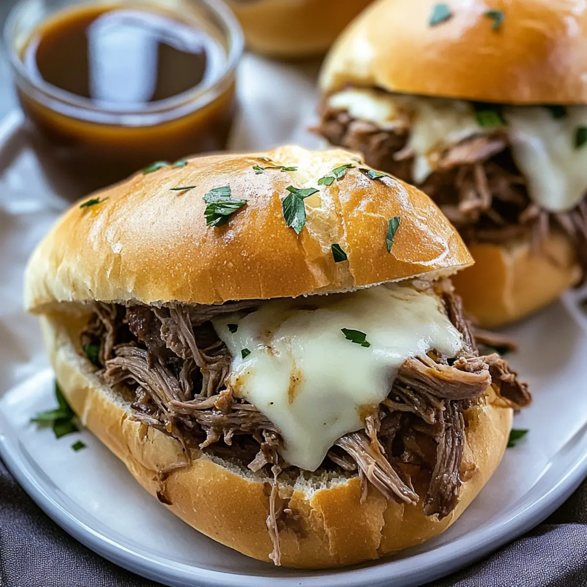 - Fill each roll with the flavorful shredded beef and serve with a small bowl of au jus for dipping.