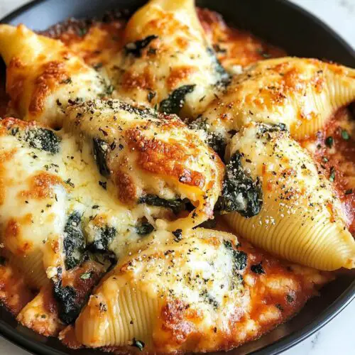 Jumbo pasta shells filled with creamy ricotta andspinach, baked in marinara sauce with melted mozzarella. Perfect for cozy dinners!