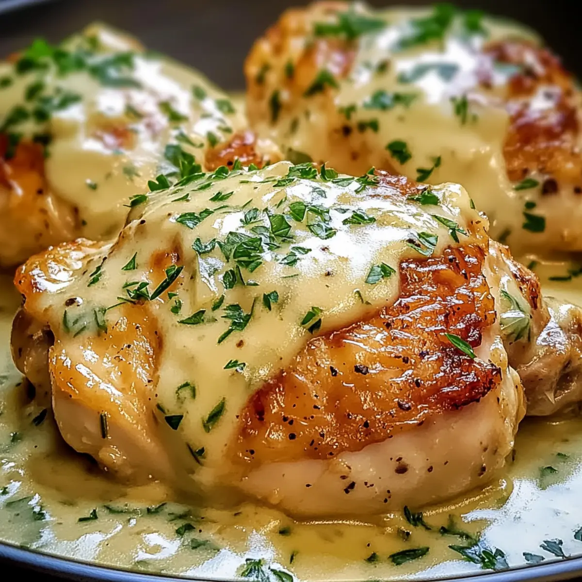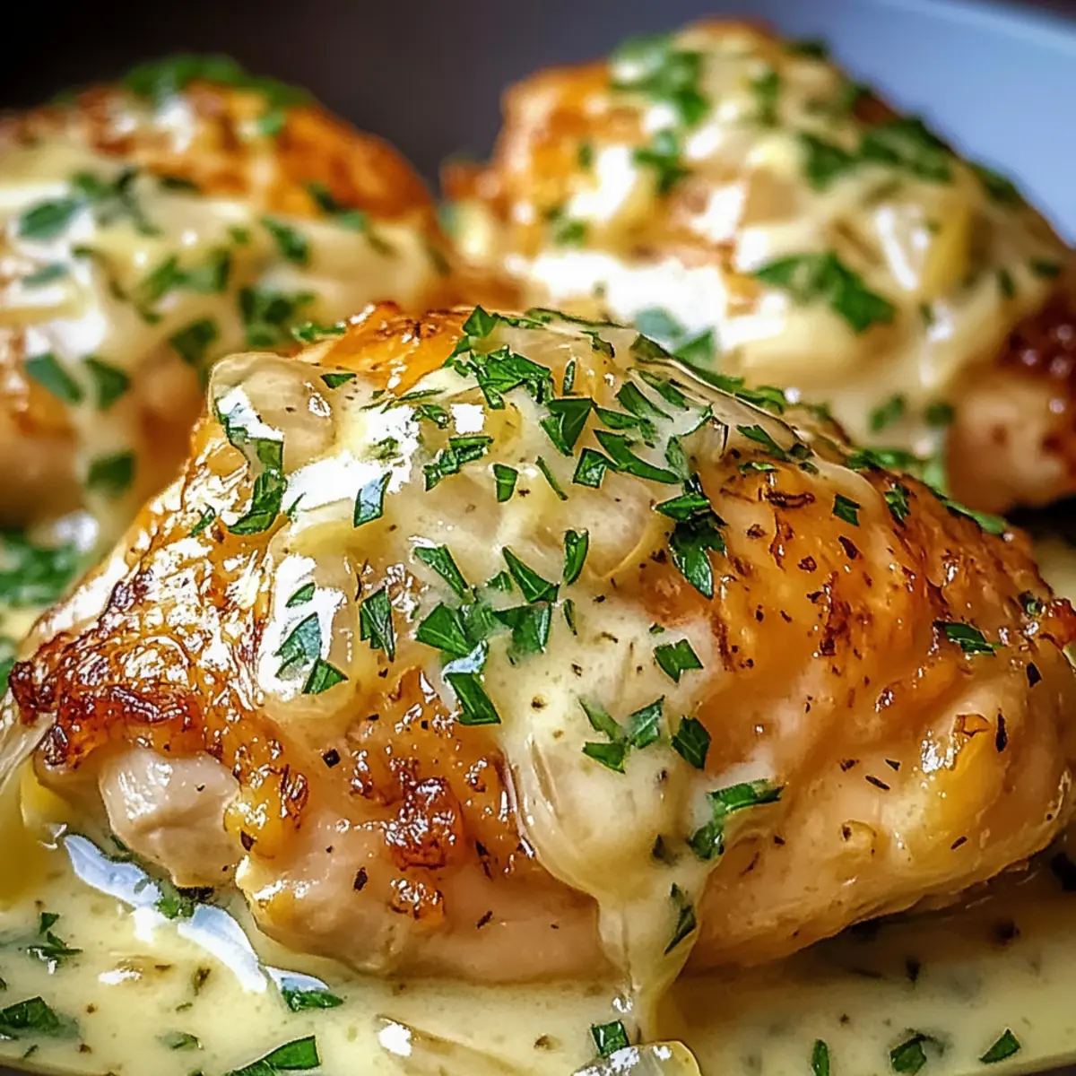 Place the seasoned chicken thighs skin-side up in the prepared baking dish. Pour the creamy sauce mixture over the chicken, ensuring each piece is well coated. The sauce will create a comforting blanket around the chicken, allowing for a moist and flavorful result you’ll love.