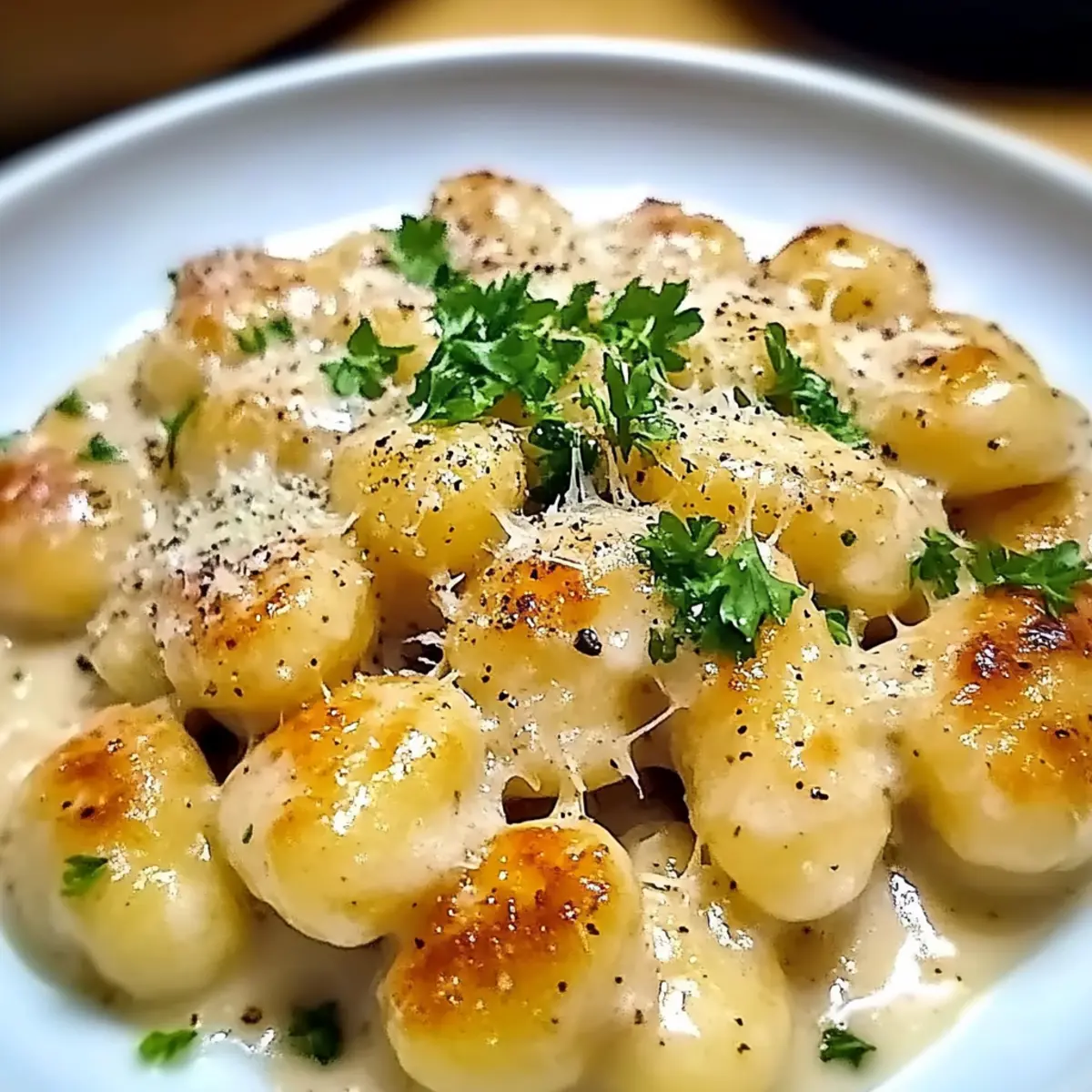 - Add crispy gnocchi back to the skillet with chopped parsley and lemon zest. Toss until evenly coated. Season with salt and black pepper to taste. Serve immediately, garnished with additional Parmesan and parsley.