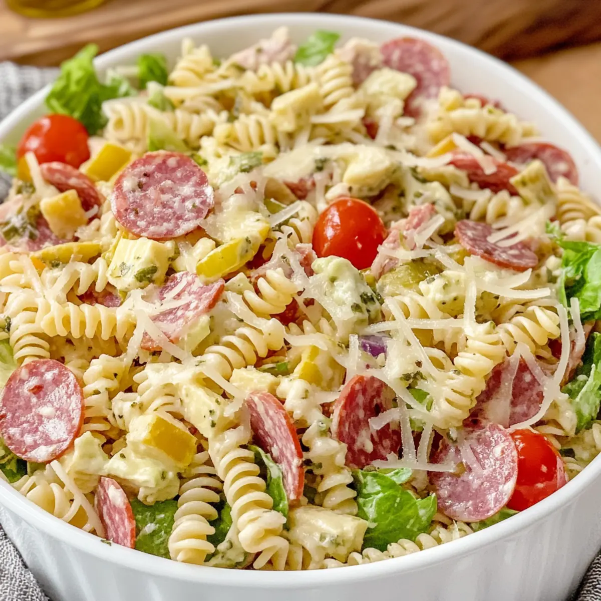 • In a large mixing bowl, combine the cooled rotini pasta, chopped meats, cheeses, vegetables, and chilled dressing. Gently toss to combine.