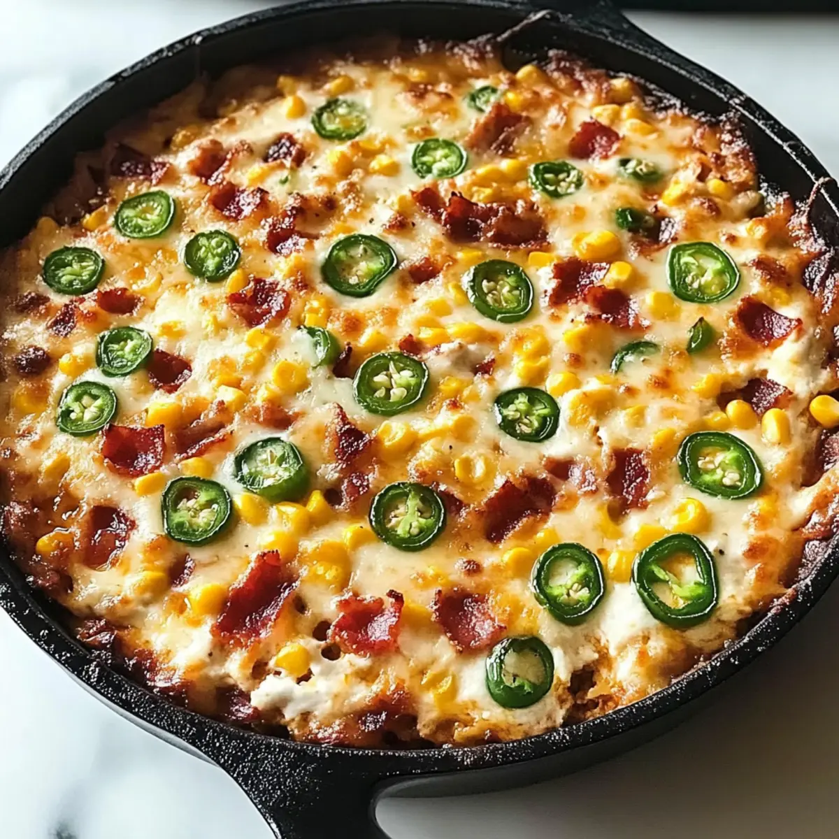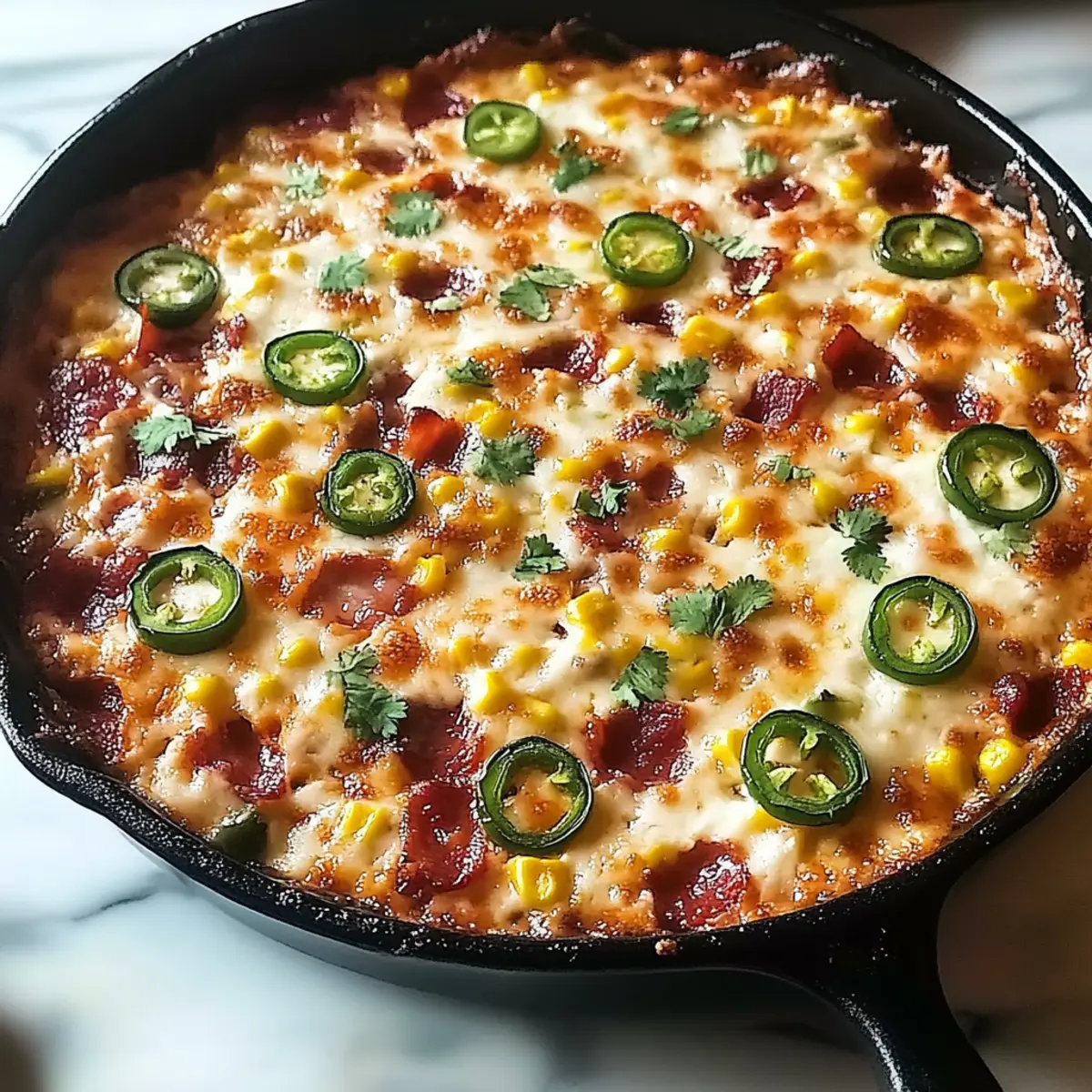 - In a large mixing bowl, combine cream cheese, shredded cheese, bacon, corn, and jalapeños. Blend until creamy.