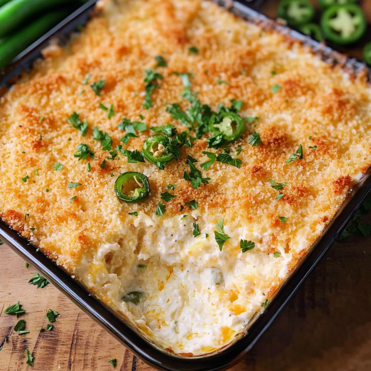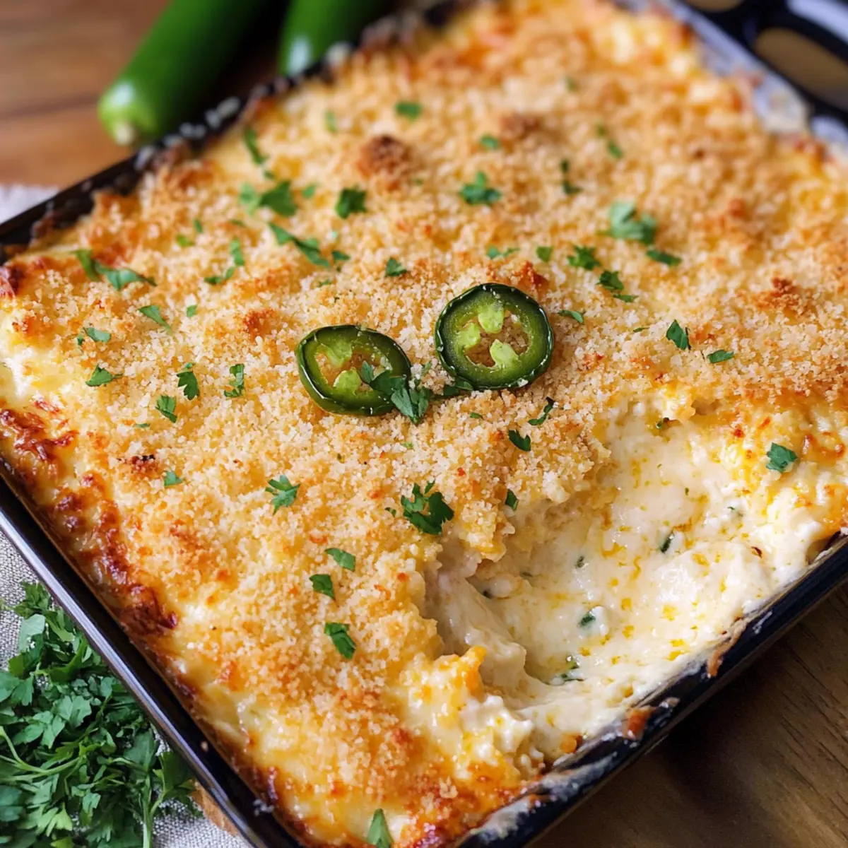 Sprinkle the panko topping evenly over the cream cheese mixture in the baking dish. Use your fingers to ensure that every part of the dip is covered for that perfect crunch in every bite. This layer is what makes the Cheesy Jalapeno Popper Dip so irresistible with its delightful topping.