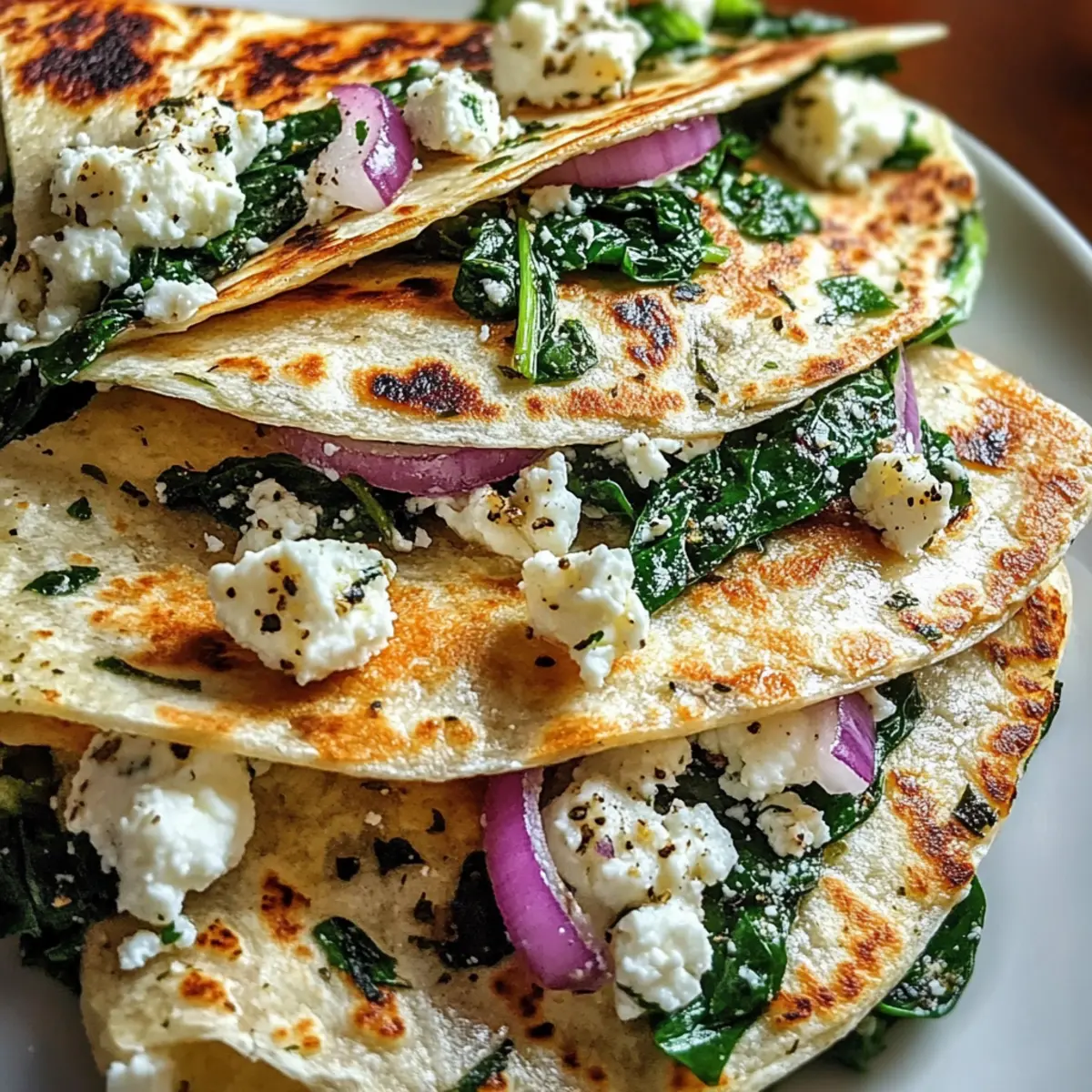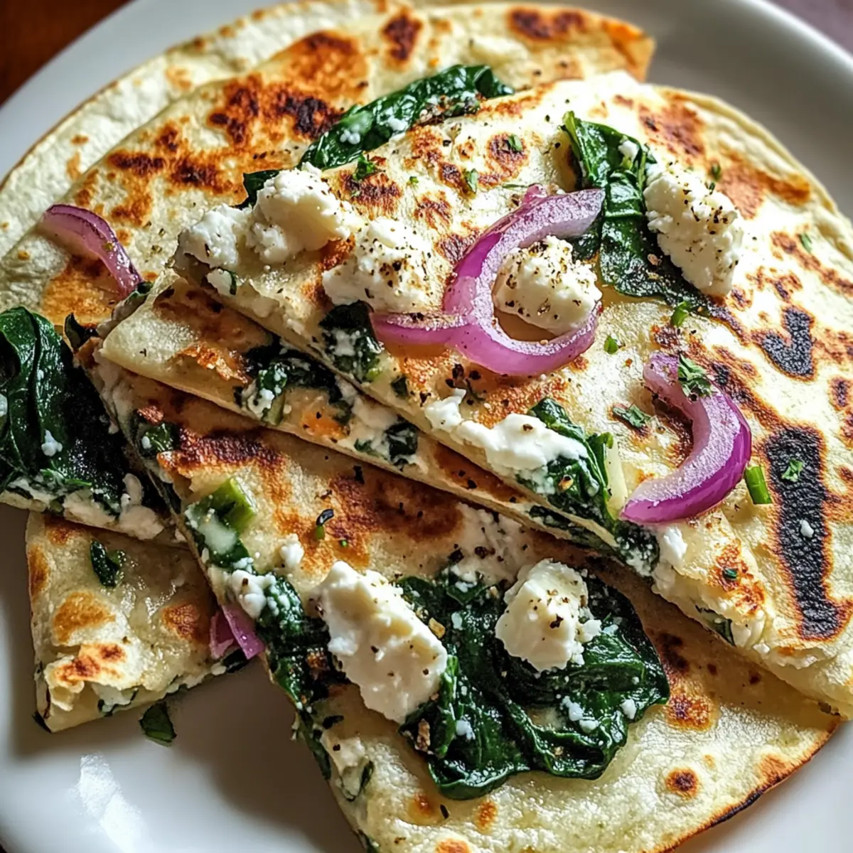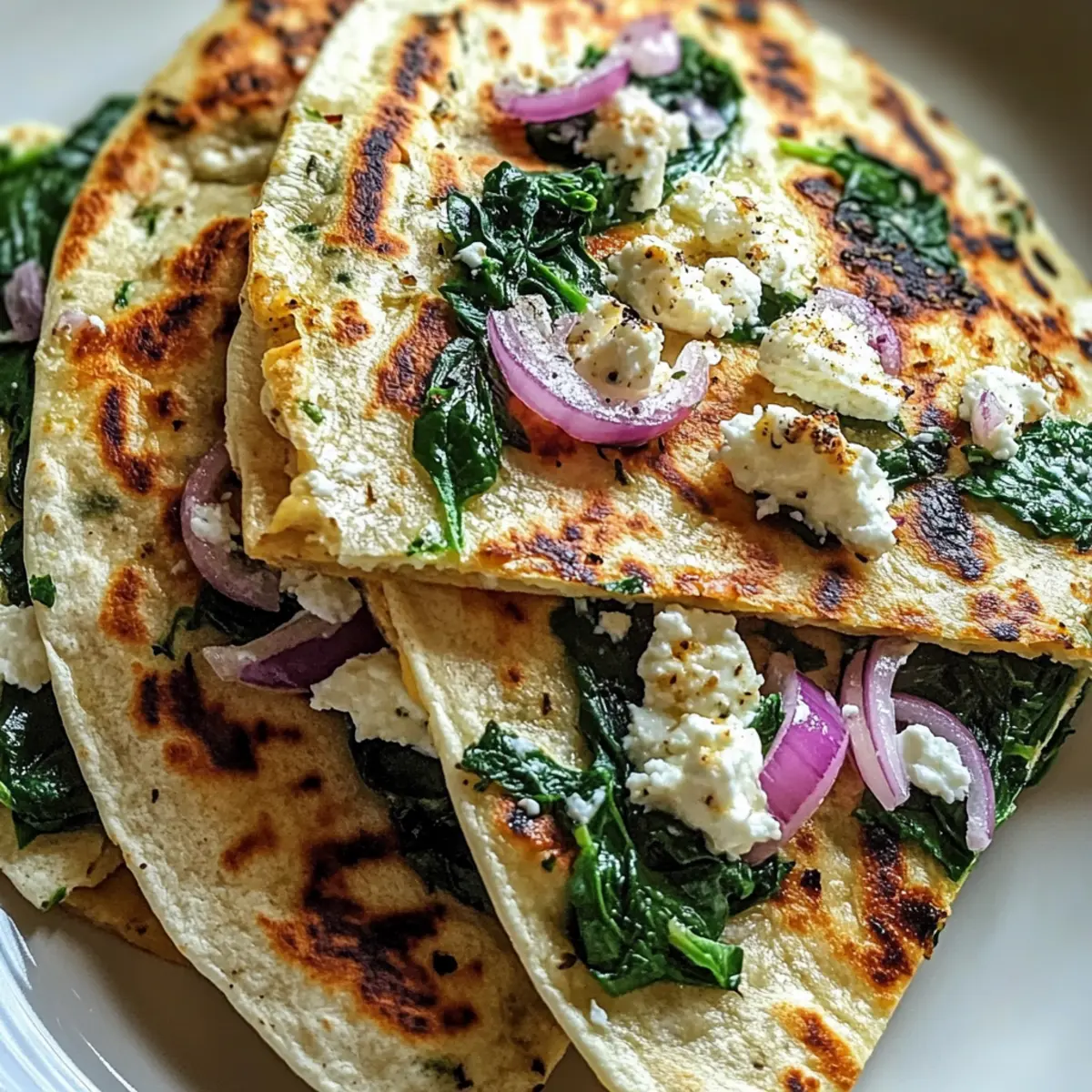After resting, slice the Mediterranean quesadillas into wedges. Serve them warm, optional with tzatziki or alongside a fresh salad to complement the flavors. Each bite is a warm, satisfying explosion of savory spinach, creamy cheeses, and zesty onions, perfect for any meal!
