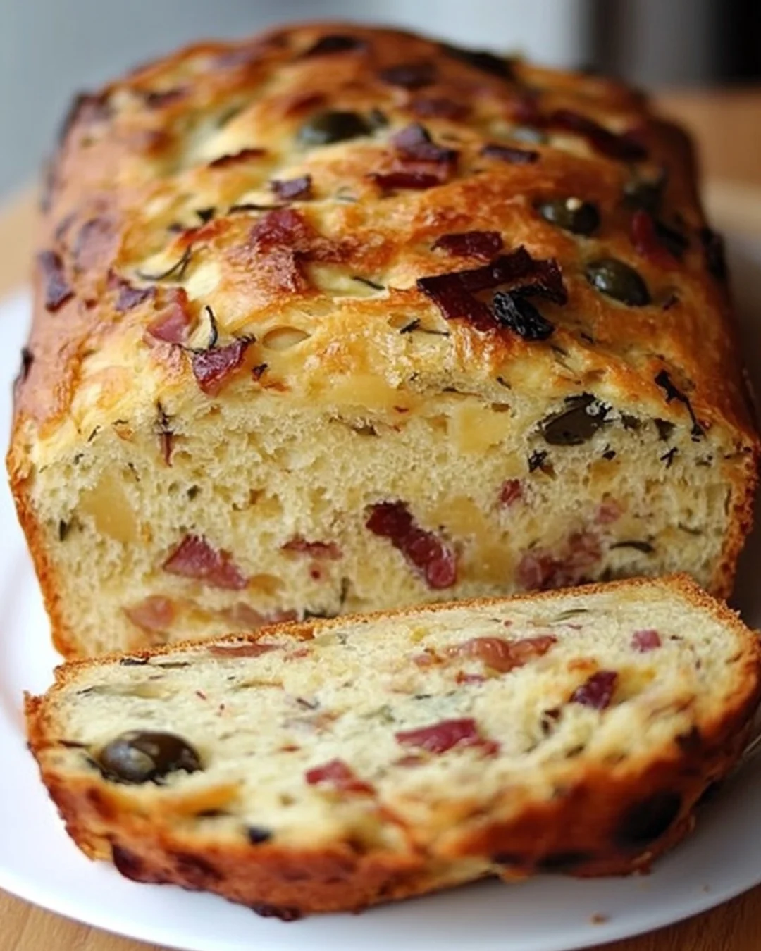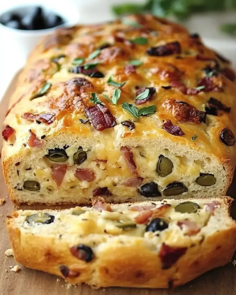 A delicious and savory bread featuring olives, bacon, and cheese, perfect for any occasion.