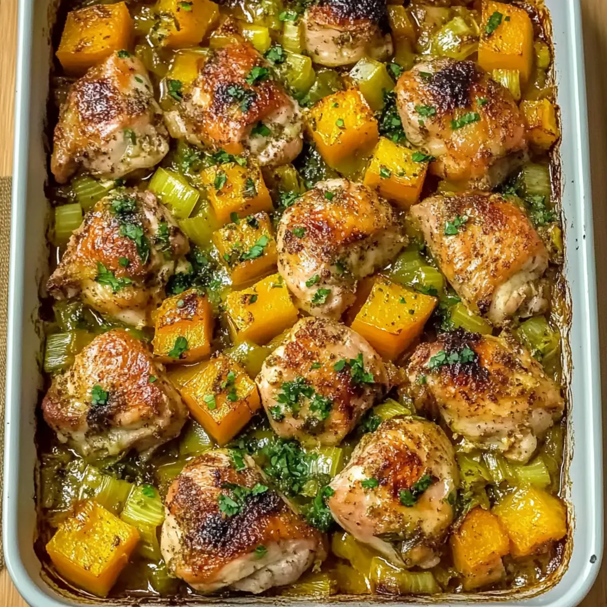 Keyword comfort food, Easy dinner, Fall recipes, family-friendly, One-pan meal, Roasted Chicken Leek and Butternut Squash Bake