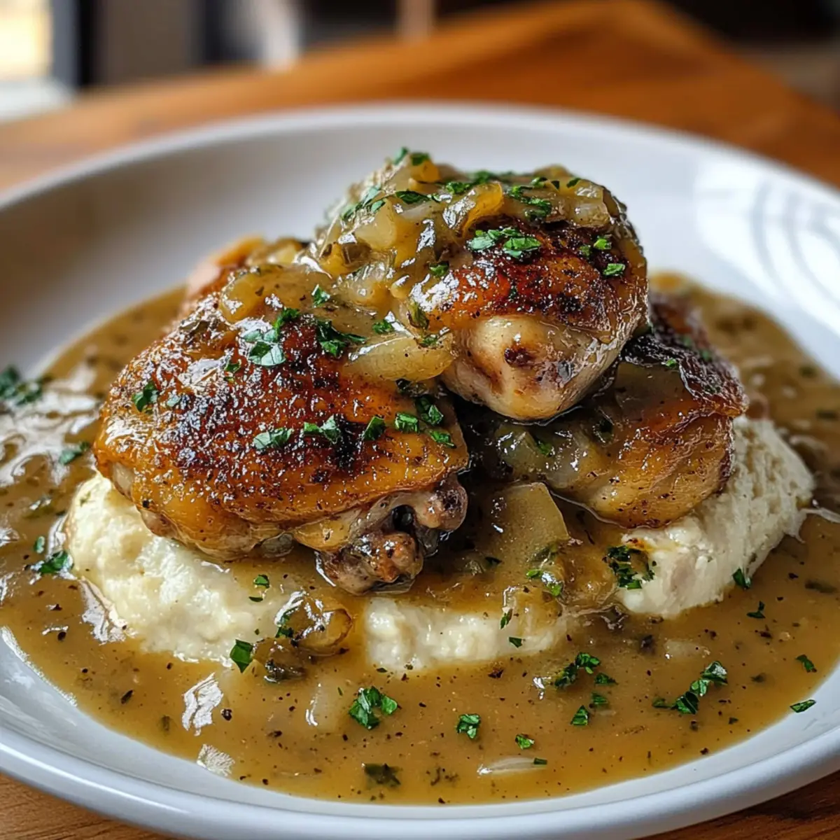 Once baked, carefully remove the pan from the oven. Lift the cover, and let the delightful aroma fill your kitchen. Spoon the rich gravy generously over the chicken thighs, allowing it to cascade down and coat every bite. Garnish with freshly chopped parsley for a pop of color, and serve hot over fluffy mashed potatoes or your favorite sides for a comforting family meal.