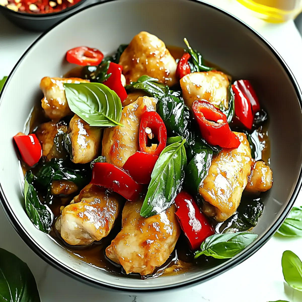 Taste your Thai Basil Chicken and adjust seasoning if necessary, adding salt and pepper to suit your palate. Serve this delightful dish over a bed of fluffy jasmine rice, allowing the sticky sauce to enhance each grain, while promising a satisfying meal that’s bursting with flavor.